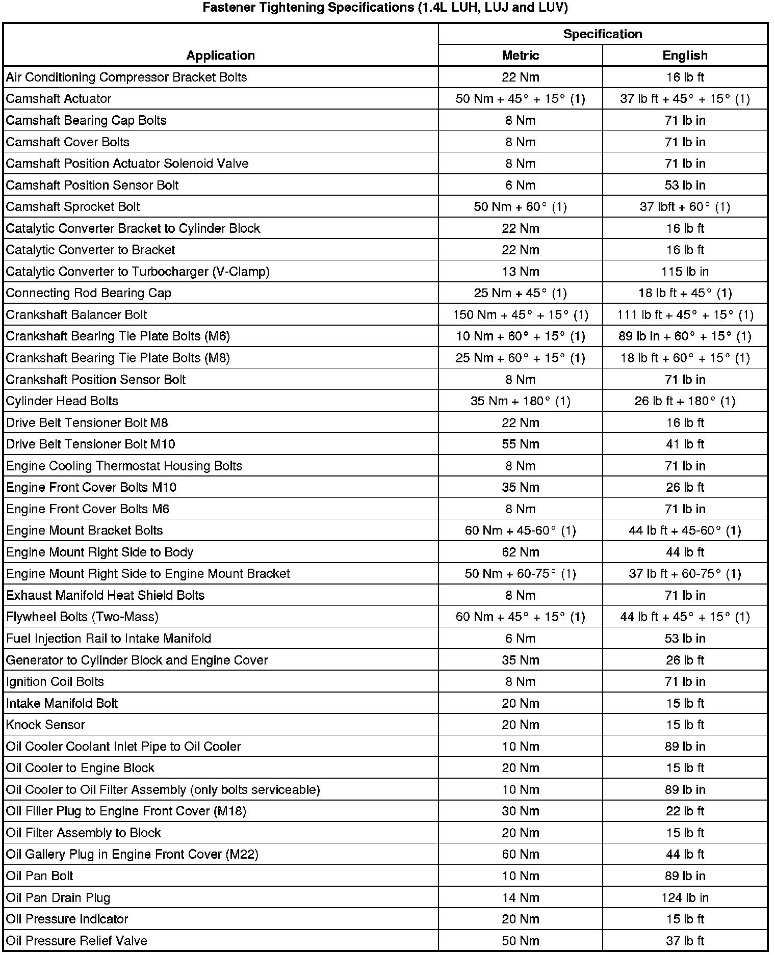 Fastener Tightening Specifications (1.4L LUH, LUJ and LUV)