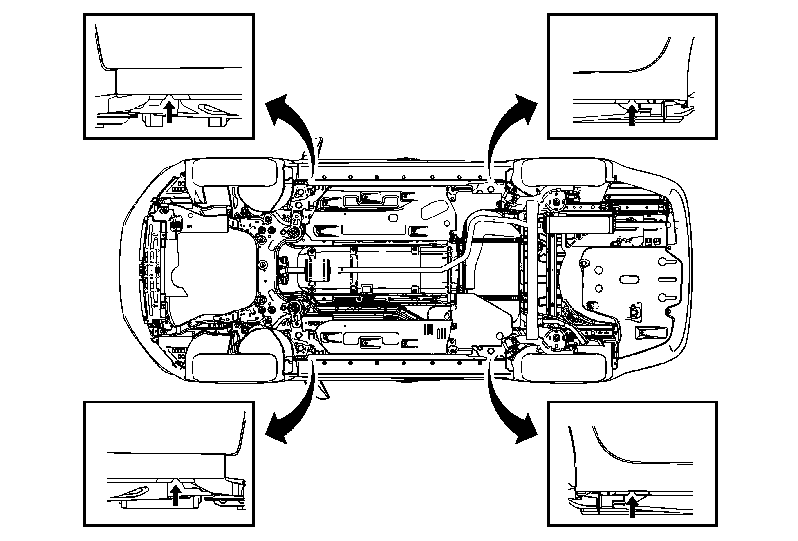 * Perform the vehicle lifting or jacking procedure only at the identified lift points. DO NOT allow the lifting equipment or jacking equipment to contact any other vehicle components.