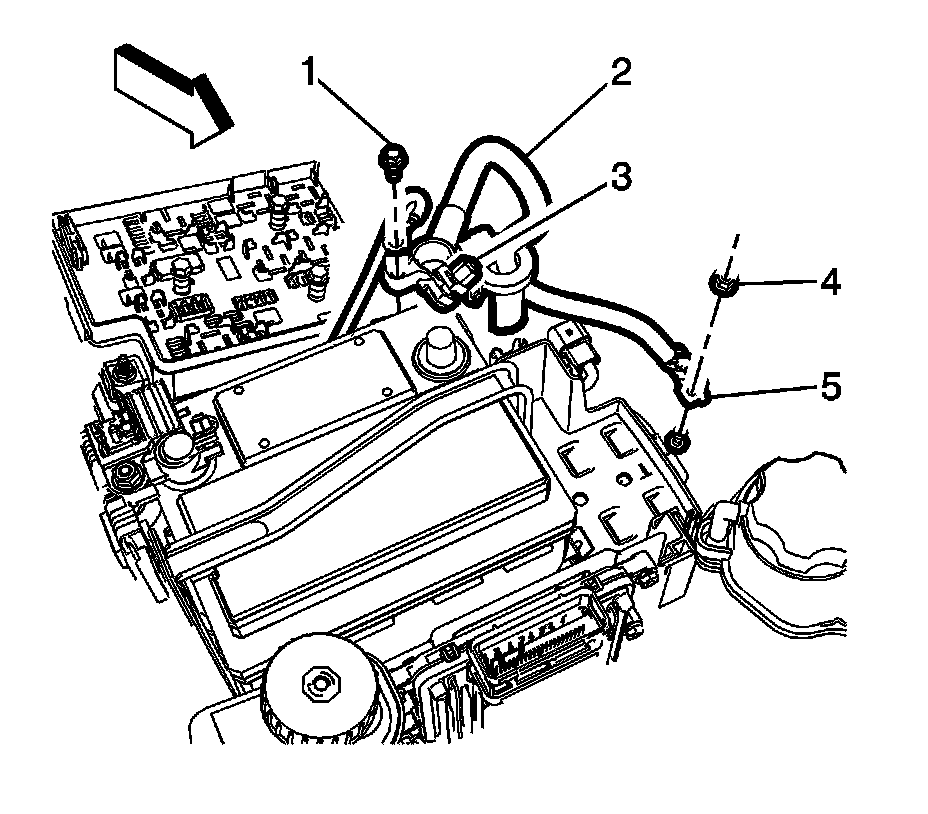 5. Remove the battery negative cable frame ground nut (4) and terminal (5).