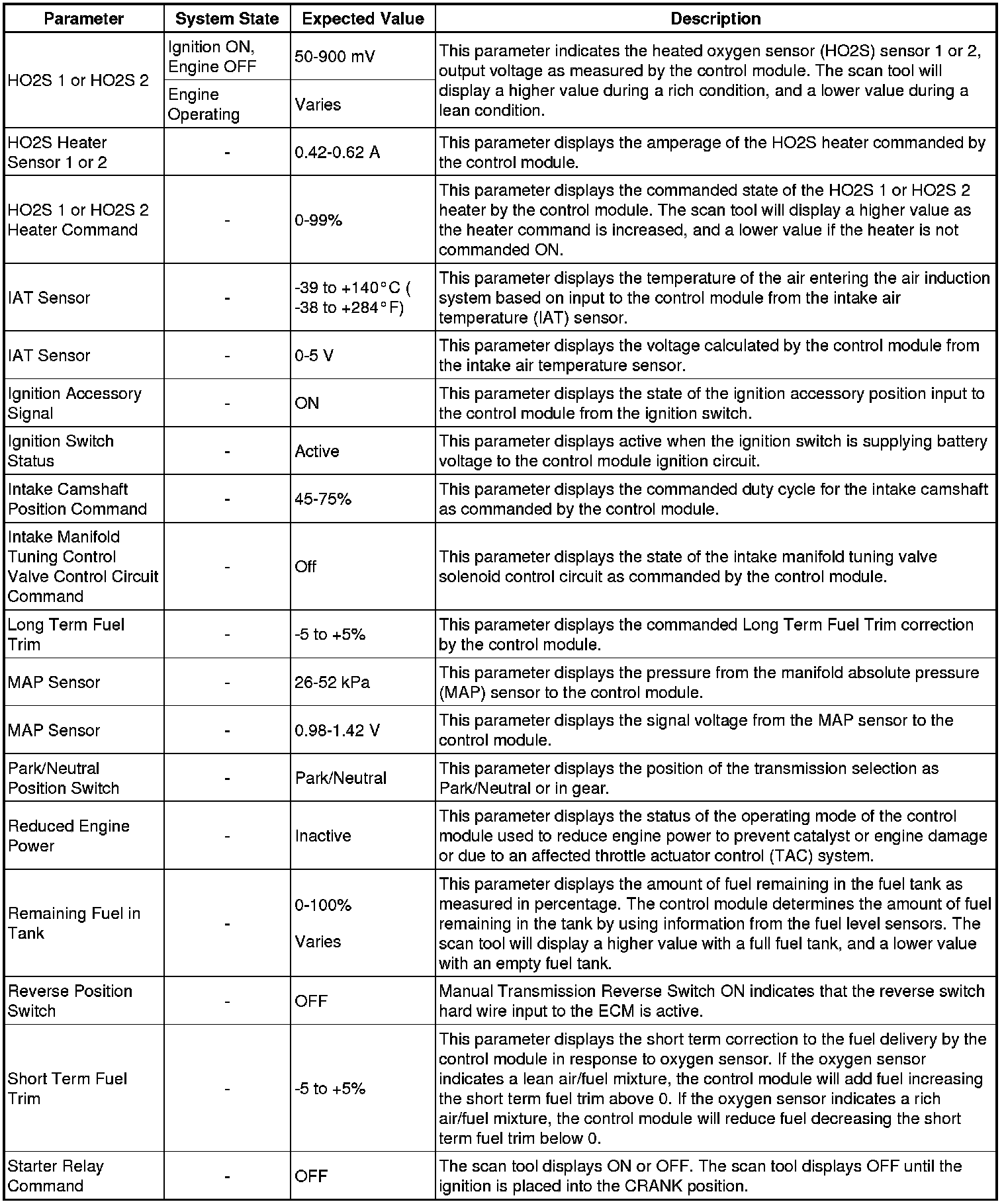 The Engine Control Module Scan Tool Data List contains all engine related parameters that are available on the scan tool. The list is arranged in alphabetical order. A given parameter may appear in any one of the data lists, and in some cases may appear more than once, or in more than one data list in order to group certain related parameters together.