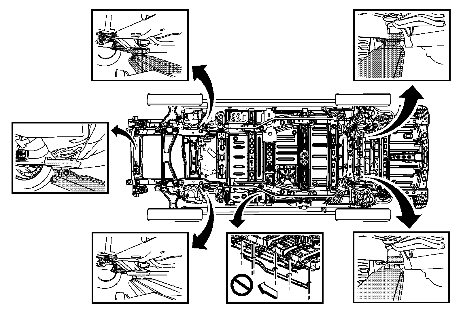 * Perform the vehicle lifting or jacking procedure only at the identified lift points. DO NOT allow the lifting equipment or jacking equipment to contact any other vehicle components.