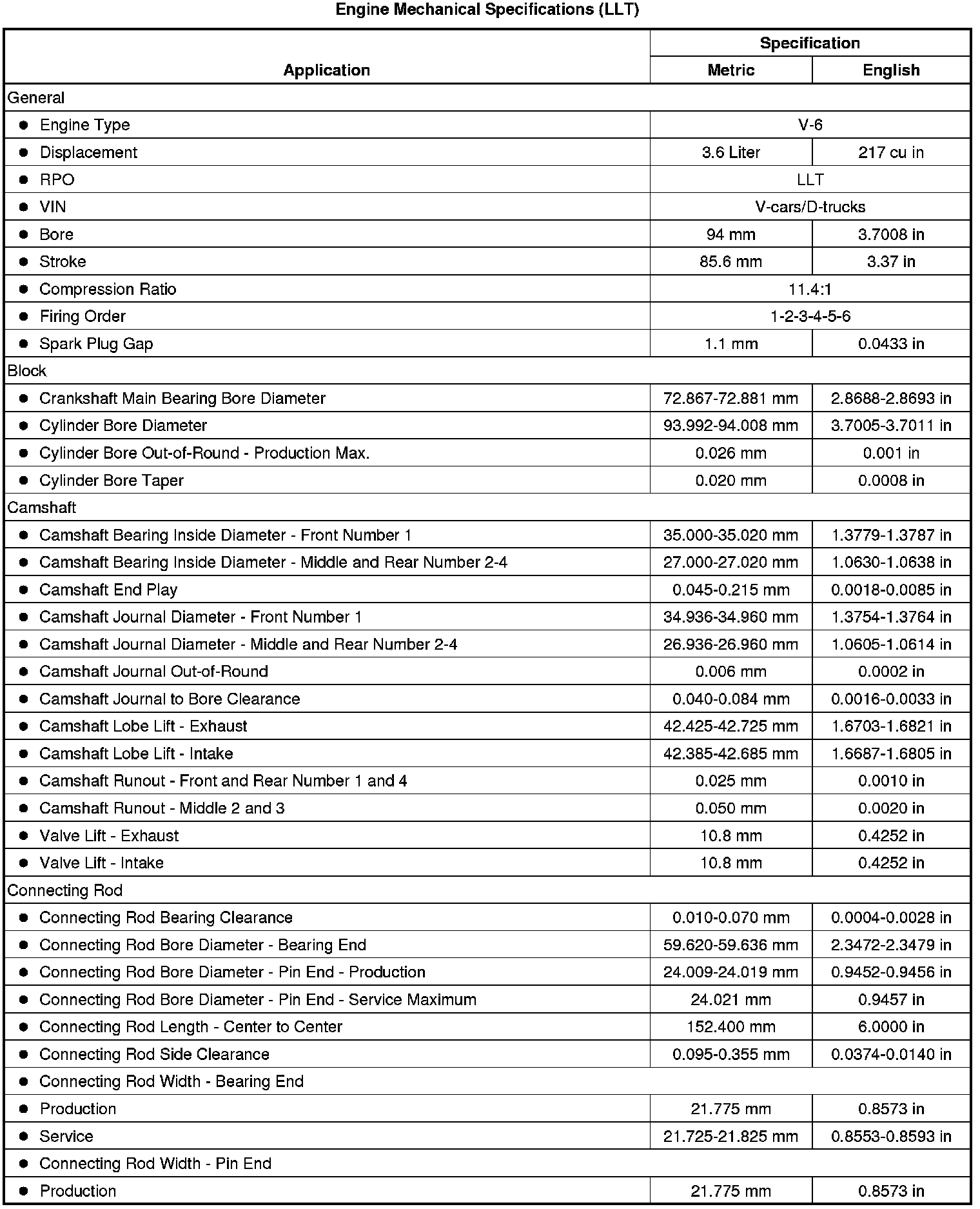 Engine Mechanical Specifications (LLT)