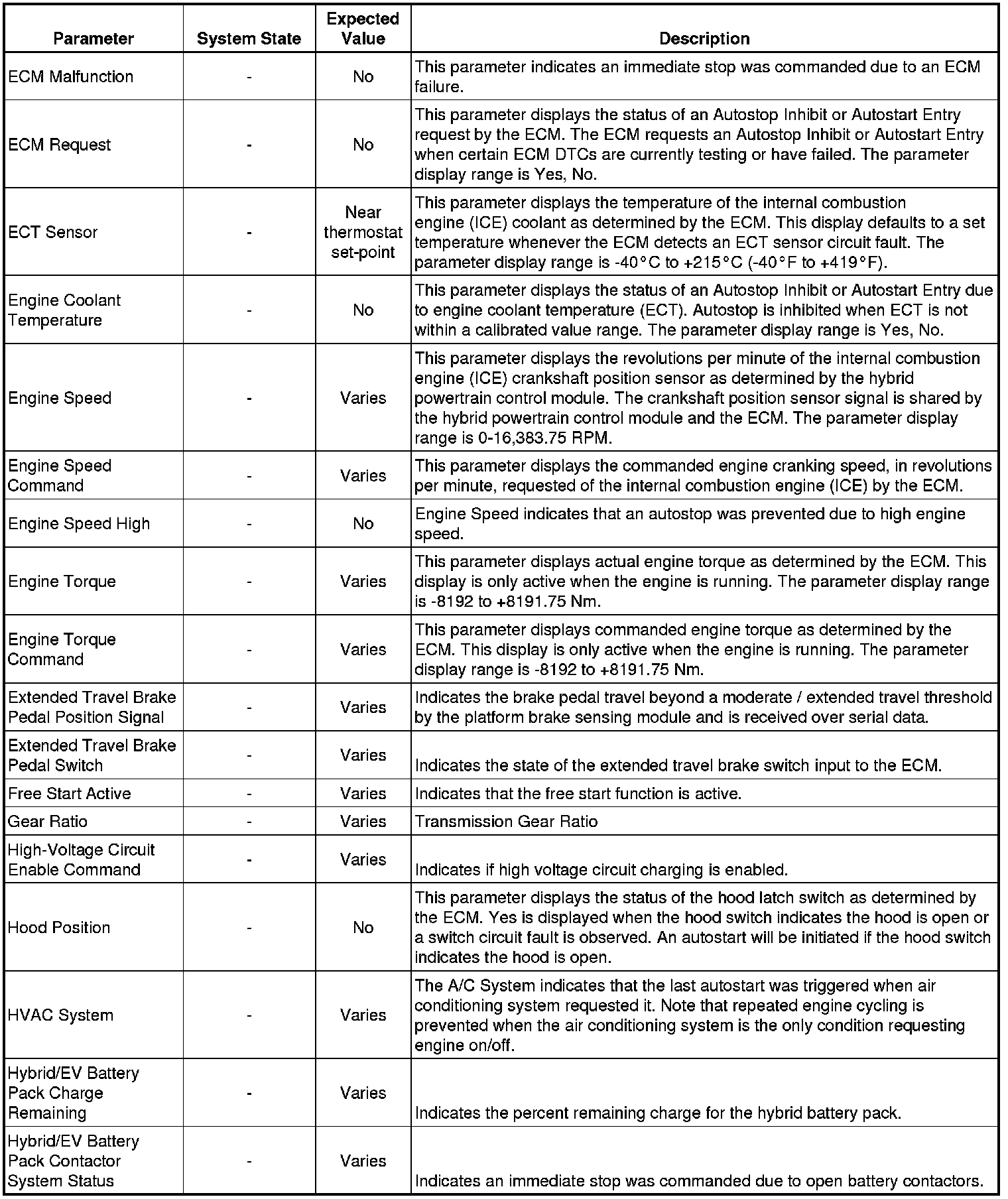 The scan tool values from a properly running vehicle may be used for comparison with the vehicle you are diagnosing. The Hybrid Powertrain Control Module Scan Tool Data Parameters list represents values that would be seen on a normally running vehicle.