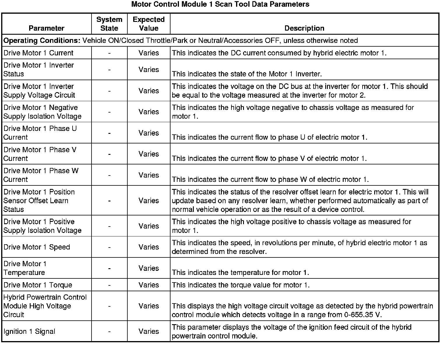 The scan tool values from a properly running vehicle may be used for comparison with the vehicle you are diagnosing. The Motor Control Module 1 Scan Tool Data Parameters list represents values that would be seen on a normally running vehicle.