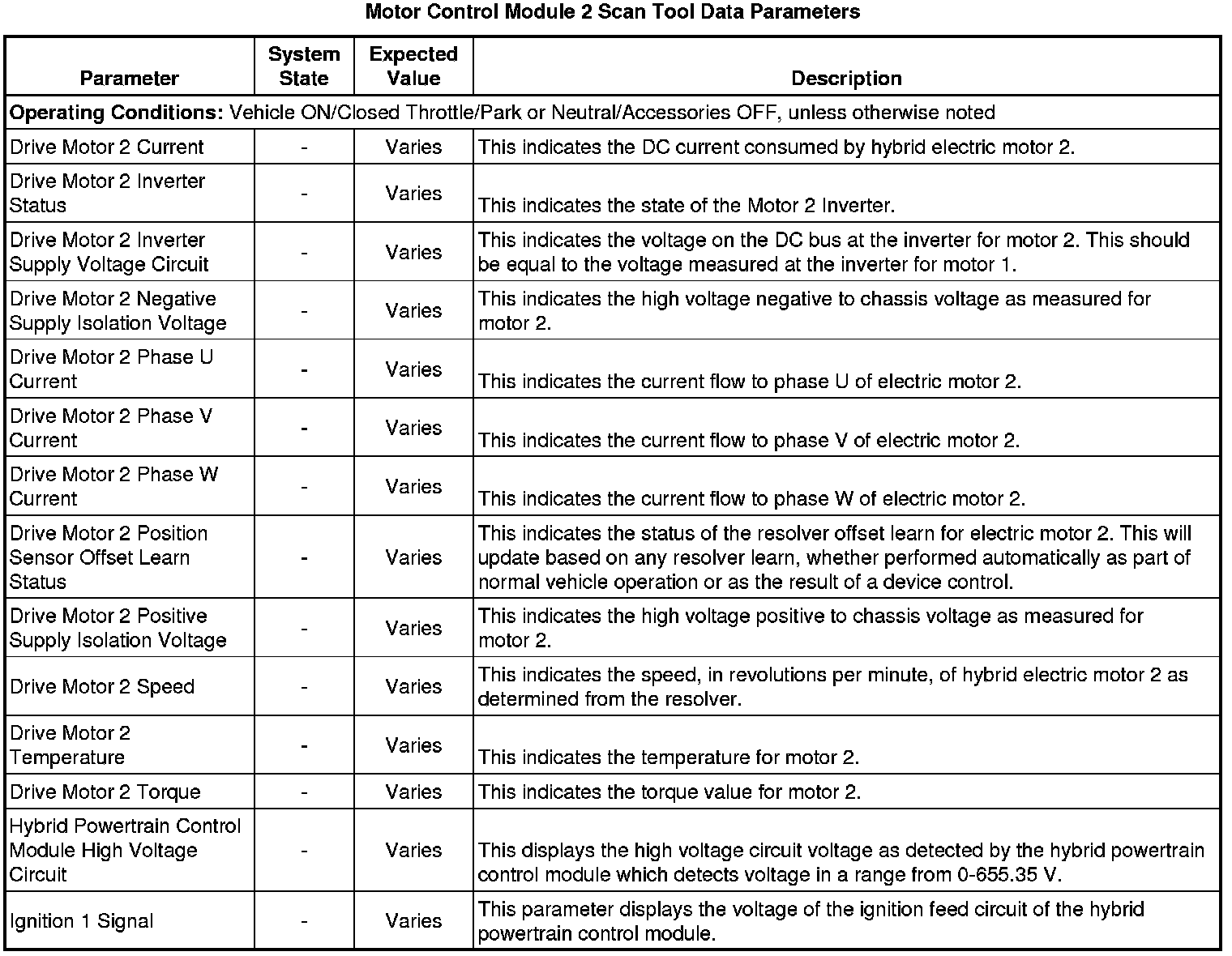 Only the parameters listed below are referenced in this service manual for use in diagnosis. If all values are within the typical range described below, refer to Symptoms - Hybrid Controls Symptoms - Hybrid Controls for diagnosis.