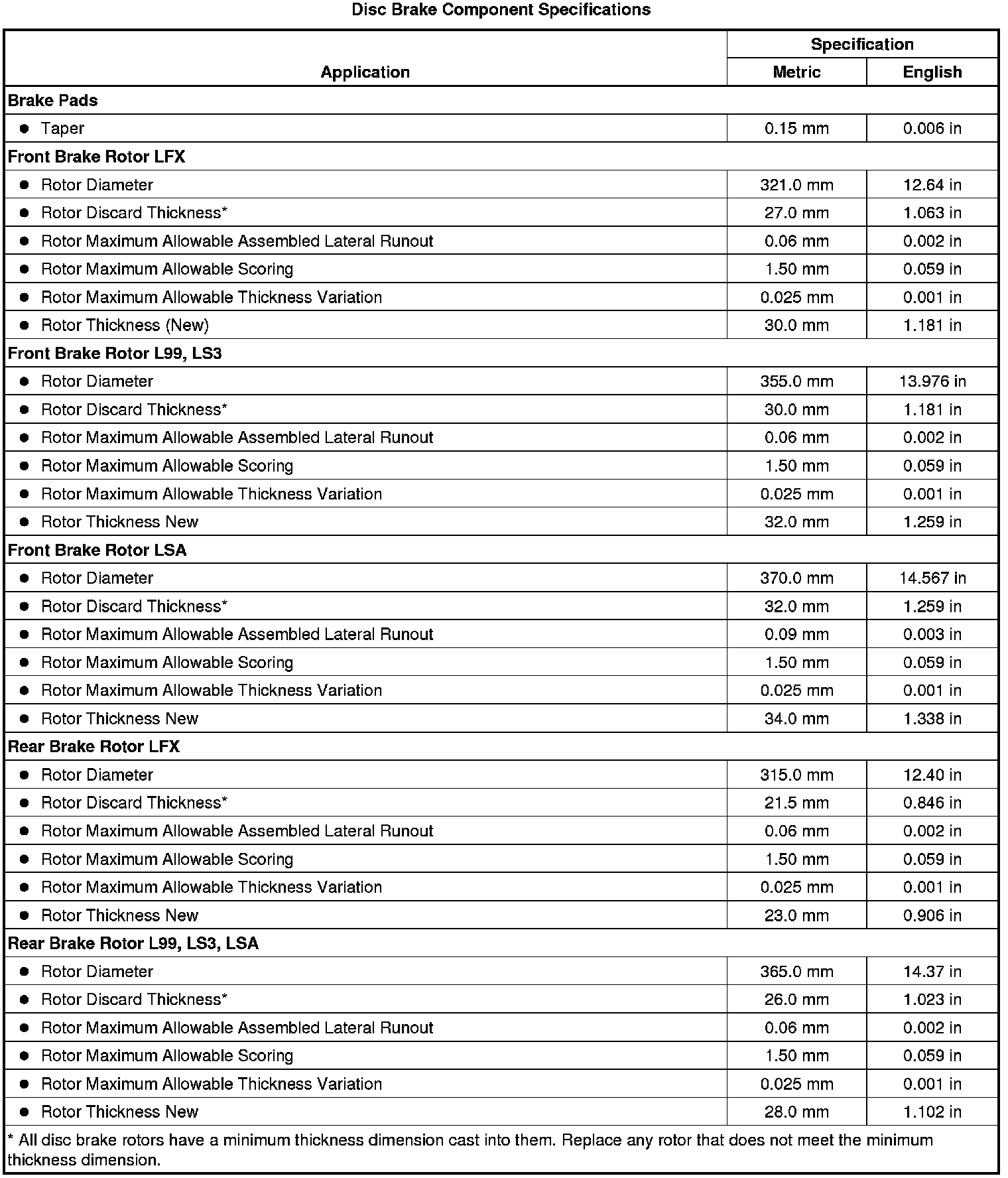 Disc Brake Component Specifications