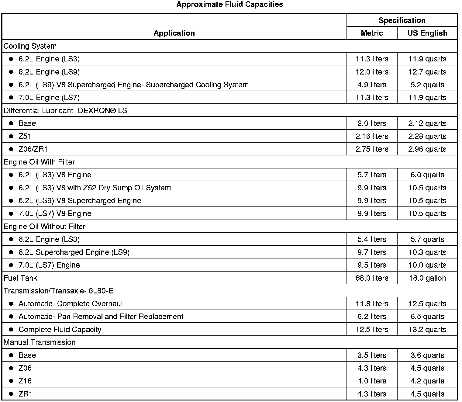 The following approximate capacities are given in US English and metric conversions. See Fluid and Lubricant Recommendations Maintenance for more information. All capacities are approximate. When adding, be sure to fill to the approximate level, as recommended in this manual. Recheck fluid level after filling.
