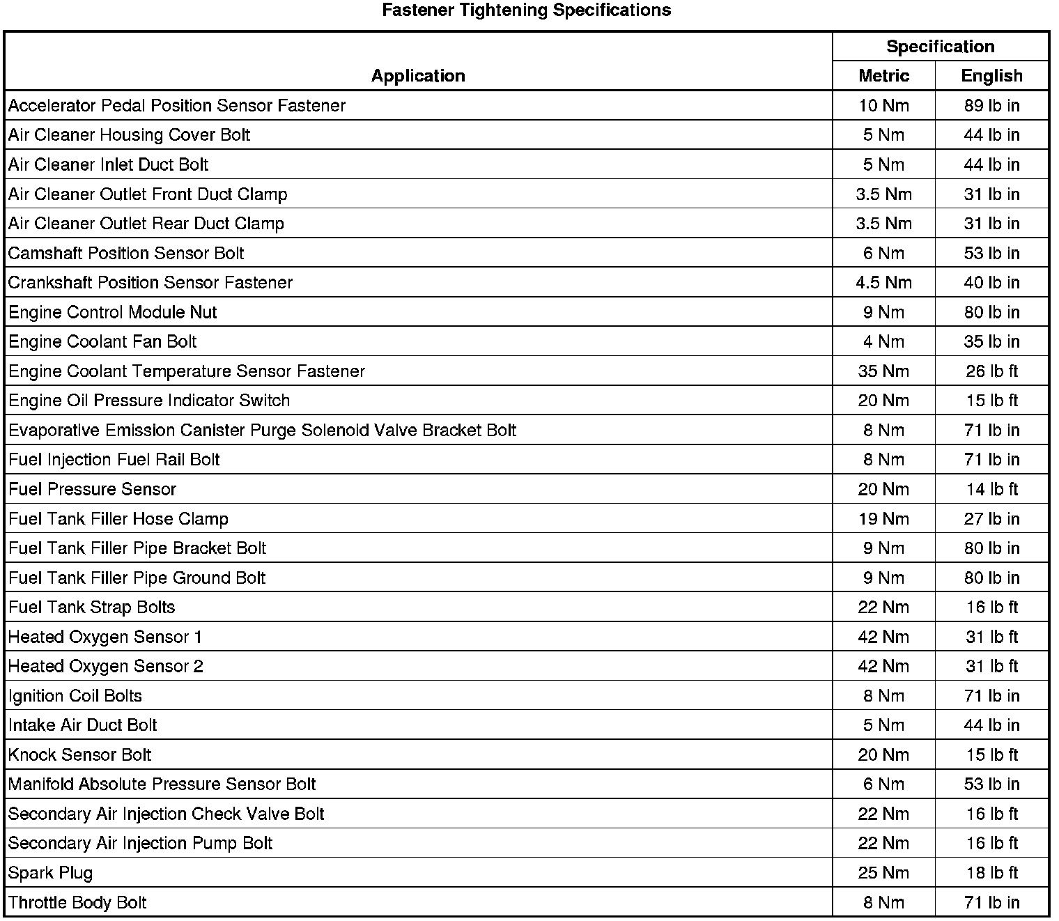 Fastener Tightening Specifications