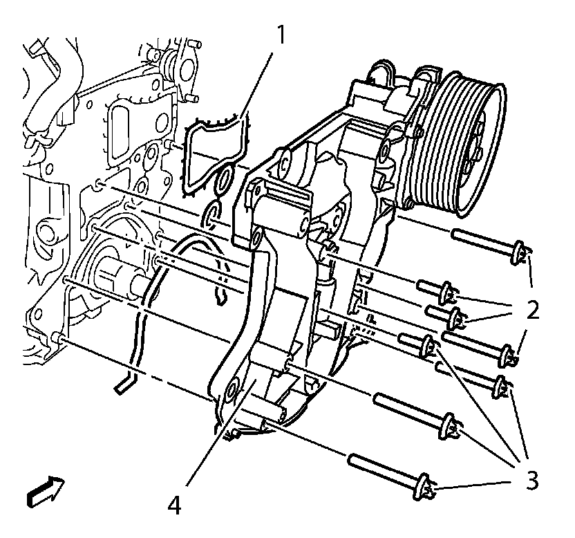 Install the 8 engine front cover bolts (2, 3) and tighten to 20 Nm (15 lb ft).
