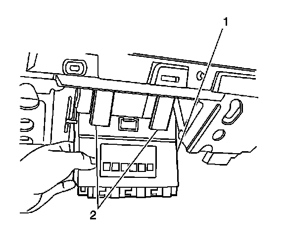 3. Release the tabs (2) retaining the BCM (1) to the bracket.