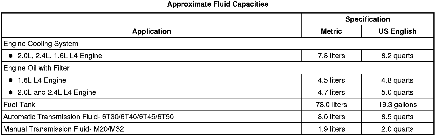 The following approximate capacities are given in US English and metric conversions. See Fluid and Lubricant Recommendations Fluids for more information. All capacities are approximate. When adding, be sure to fill to the approximate level, as recommended in this manual. Recheck fluid level after filling.