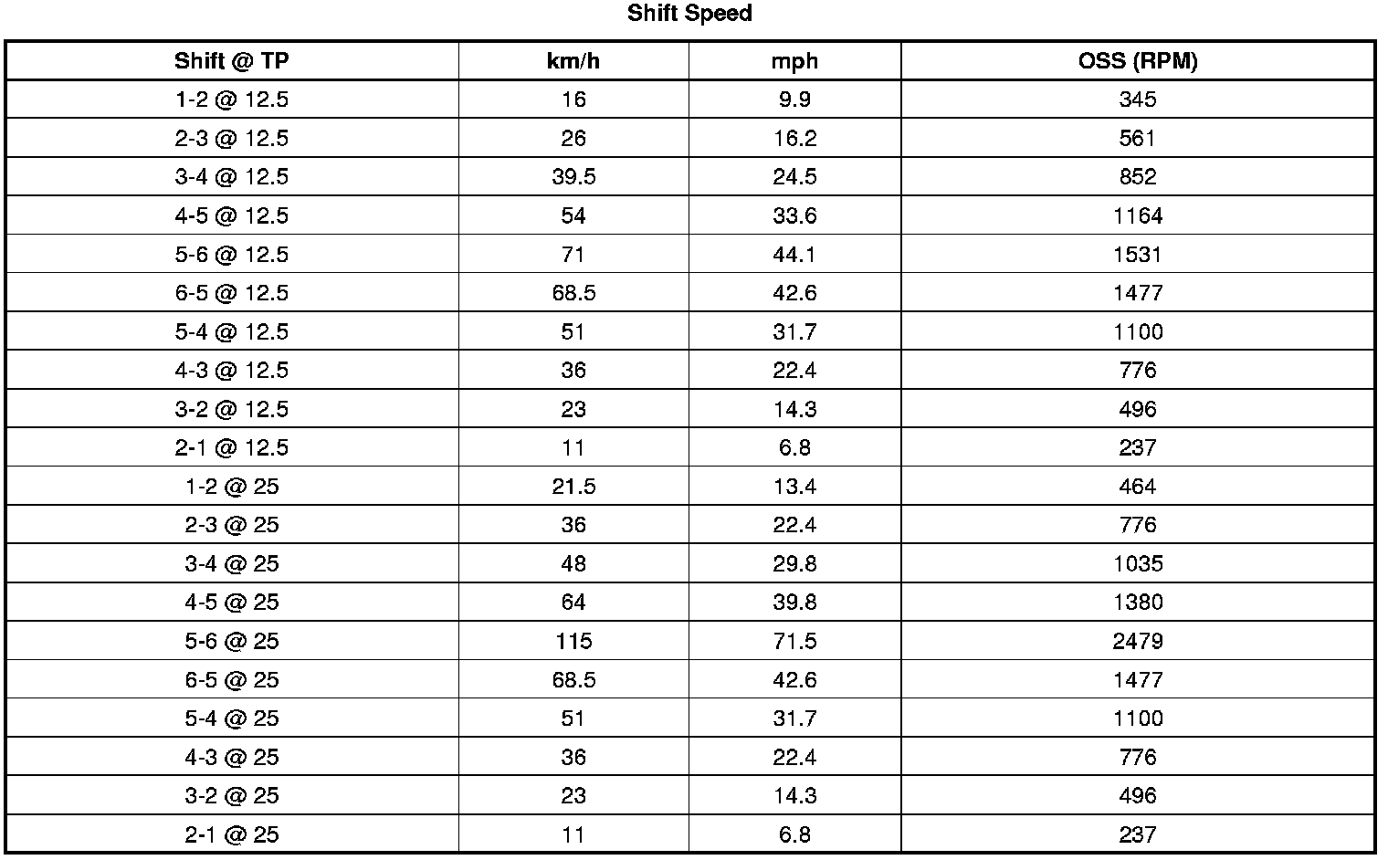 Shift speed points are affected by many different vehicle and transmission operating conditions. The table above represents shift speed points calibrated at specific throttle angles during normal operating conditions and a temperature range between 0-130°C (32-266°F). These shift speed points are also based on an effective final drive ratio of 3.16, and assume a production-intent tire size. The table below illustrates a number of different variables that influence these shift speed points. Based on a given operating condition, these variables may override the normal shift speed points. To assist in monitoring the different variables, the respective scan tool data parameter is also listed.
