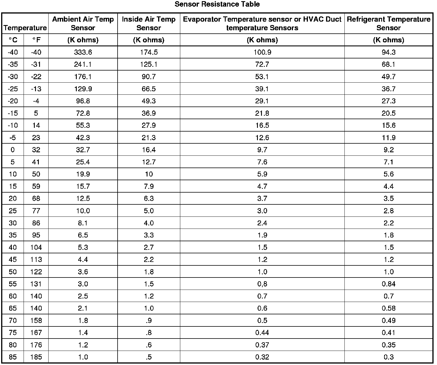 Sensor Resistance Table