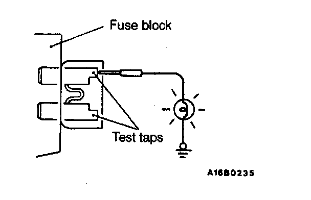 A blade type fuse has test taps provided to allow checking of the fuse itself without removing it from the fuse block. The fuse is okay if the test light comes on when its one lead is connected to the test taps (one at a time) and the other lead is grounded.