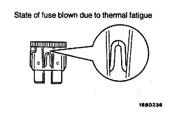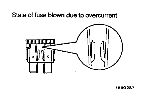 1. Fuse blown due to current exceeding rating The illustration shows the state of a fuse blown due to this cause. In this case, do not replace the fuse with a new one hastily since a current heavy enough to blow the fuse has flowed through it. First, check the circuit for shorting and check for abnormal electric parts. After correcting shorts or replacing parts, the use only a fuse of the same capacity should be used as a replacement. Never use a fuse of larger capacity than the one that has blown. If such a fuse is used, electric parts or wirings could be damaged before the fuse blows in the event an overcurrent occurs again.
