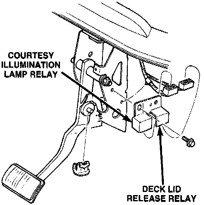 The deck lid release relay is located on the right side of the brake pedal mounting bracket.
