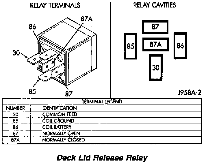 2. The relay normally open terminal (87) is connected to the common feed (movable contact) terminal (30) in the energized position. This terminal when energized supplies battery voltage to the deck lid release solenoid. If OK, go to Step 3. If not OK, repair the open circuit to the deck lid release solenoid as required.