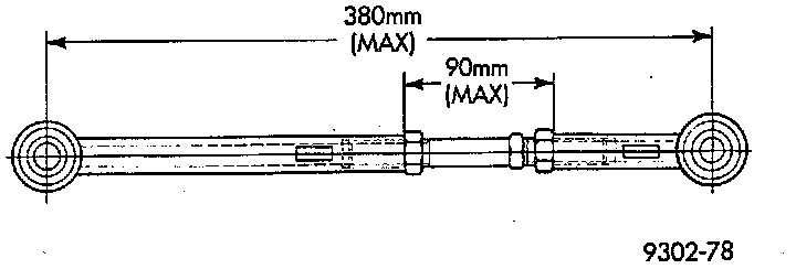 CAUTION: When setting rear ,"Toe In" on vehicle. The maximum lengths of the adjustable lateral link at the locations shown must not be exceeded. If these maximum lengths are exceeded, inadequate retention of adjustment link to the inner and outer link may result. Ensure that the adjustment sleeve jam-nuts are torqued to the required specifications when the Toe setting procedure is completed.