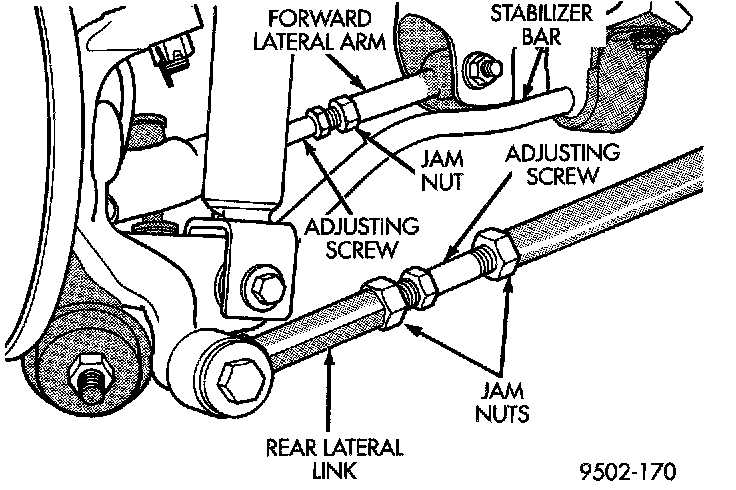 1. For either rear wheel needing alignment, loosen the adjusting screw jam nuts on both the front and the rear lateral links.
