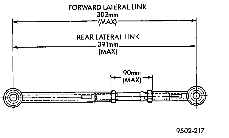 - When setting rear camber and toe on the vehicle, the maximum lengths of the adjustable lateral link at the locations shown must not be exceeded. If these maximum lengths are exceeded, inadequate retention of adjustment link to the inner and outer link may result.
