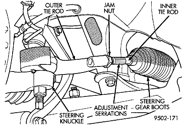 CAUTION: Do not twist front inner tie rod to steering gear rubber boots during front wheel toe adjustment.