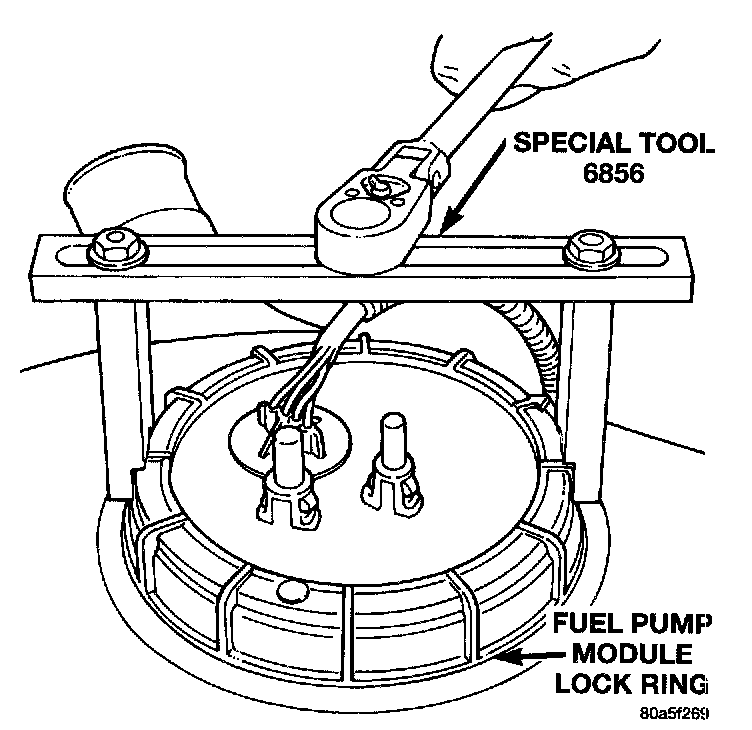 6. Using Special Tool #6856 Fuel Pump Module Ring Spanner, remove locknut to release pump module.