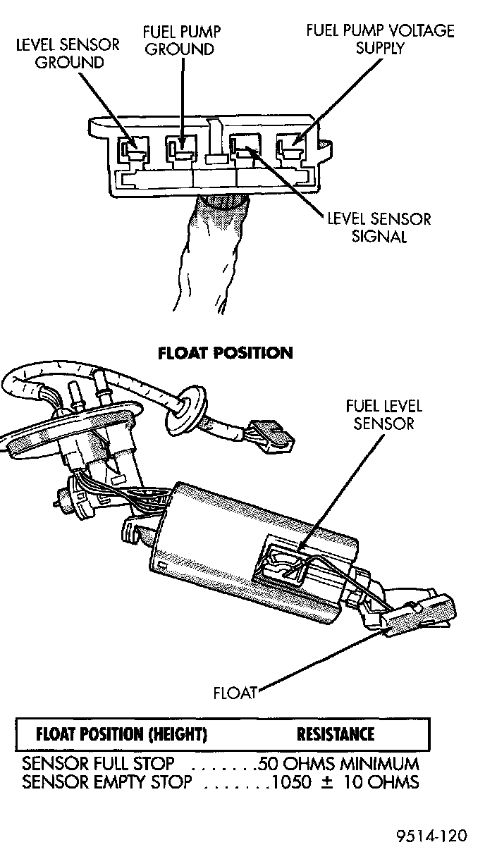 The level sensor is a variable resistor. Its resistance changes with the amount of fuel in the tank. The float arm attached to the sensor moves as the fuel level changes. To test the level sensor, connect an ohmmeter across the sensor signal and sensor ground terminals of the fuel pump module connector. Move the float lever over the entire range to the positions shown in the resistance chart.