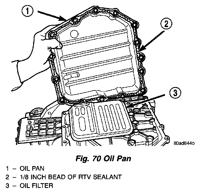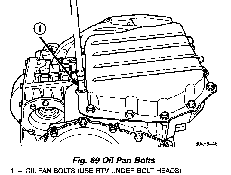 7. Install an 1/8" bead of RTV as shown in (Fig. 70) and install pan to case.