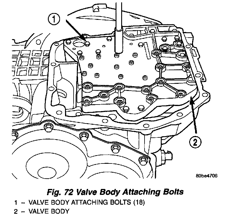 5. Install the valve body-to-case bolts (Fig. 72) and torque to 12 Nm (105 inch lbs.).
