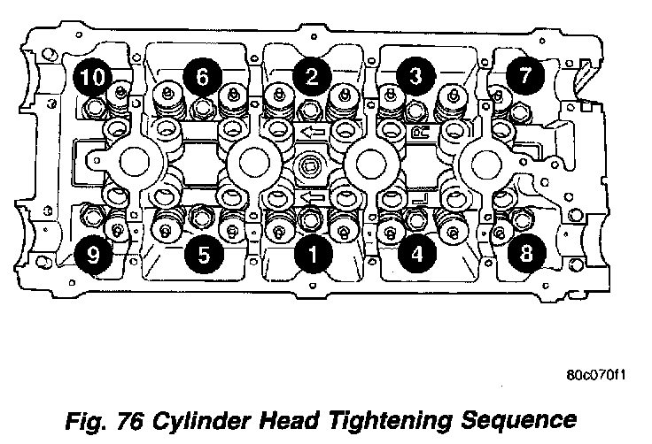 Tighten the cylinder head bolts in the sequence shown. Using the 4 step torque turn method, tighten according to the following values: