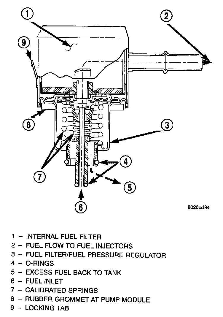 A combination fuel filter and fuel pressure regulator is used on all gas powered engines. It is located on the top of the fuel pump module.
