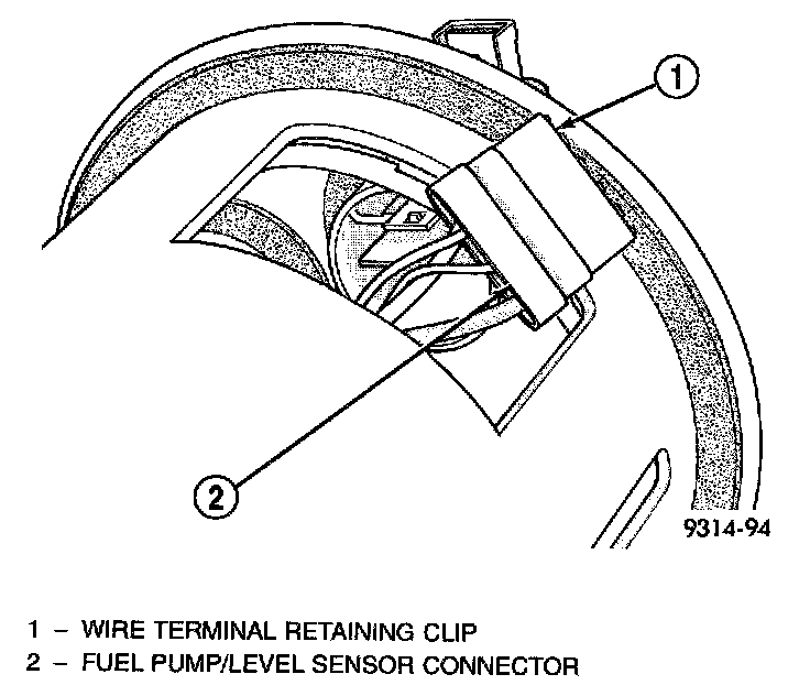 1. Depress the retaining tab and remove the fuel pump/level sensor connector from the bottom of the fuel pump module electrical connector.