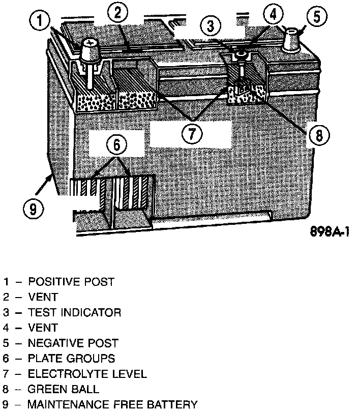 A clear color dot shows electrolyte level in battery is below the test indicator. Water cannot be added to a maintenance free battery. The battery must be replaced. A low electrolyte level may be caused by an over charging condition. Refer to Generator for proper test procedures on Vehicle.