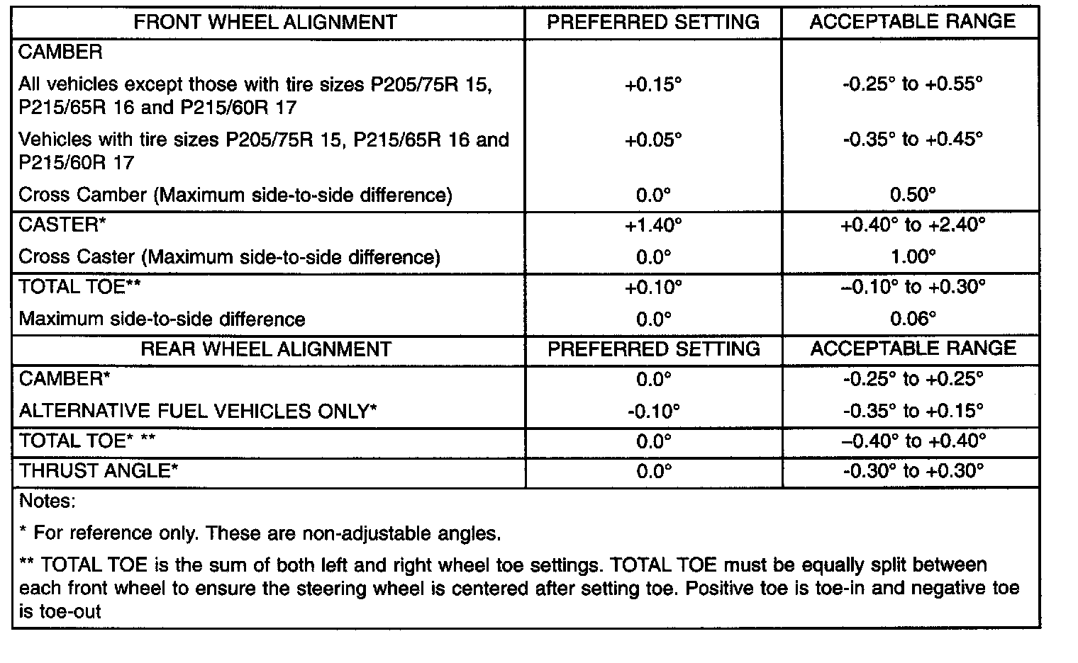 Wheel Alignment Specifications Chart