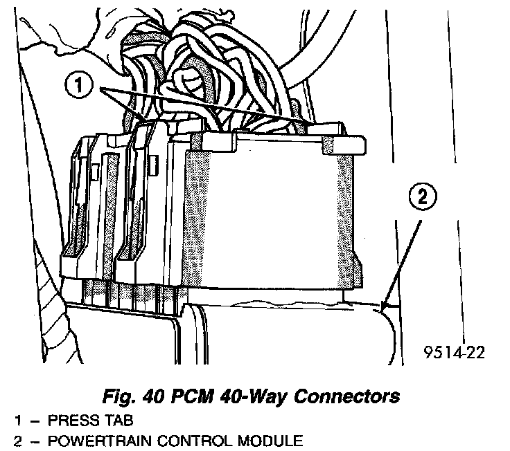 8. Squeeze tabs on 40-way connector. Pull connector rearward to remove from PCM. Remove both way connectors.