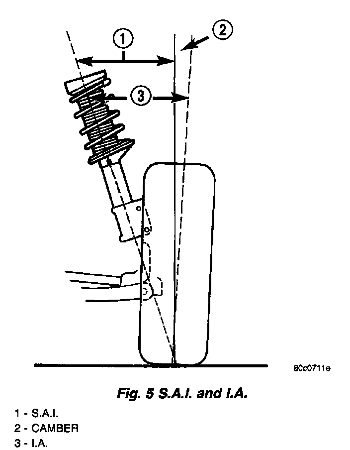 Steering axis inclination is the angle between a true vertical line starting at the center of the tire at the road contact point and a line drawn through the center of the upper ball joint (or strut) and the lower ball joint. S.A.I. is built into the vehicle and is not an adjustable angle. If S.A.I. is not within specifications, a bent or damaged suspension component may be the cause.