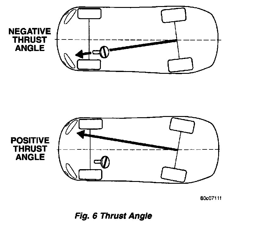 Thrust angle is the averaged direction the rear wheels are pointing in relation to the vehicle's center line. The presence of negative or positive thrust angle causes the rear tires to track improperly to the left or right of the front tires (dog tracking).