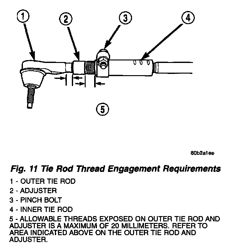 CAUTION: When setting toe on vehicle, the maximum dimension of exposed threads allowed on inner and outer tie rod cannot exceed the distance shown. If the maximum distance is exceeded, inadequate retention of either inner or outer tie rod may result. Ensure that adjustment pinch bolt is torqued to required specification when Toe setting procedure is completed.