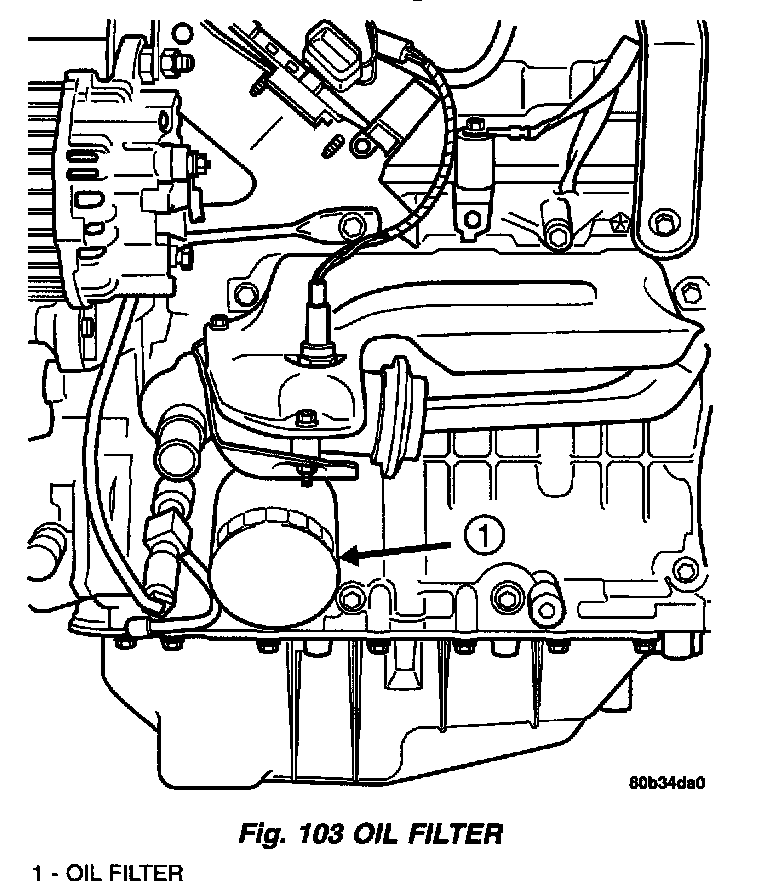 1. Using a suitable oil filter wrench, unscrew filter from base and discard (Fig. 103).