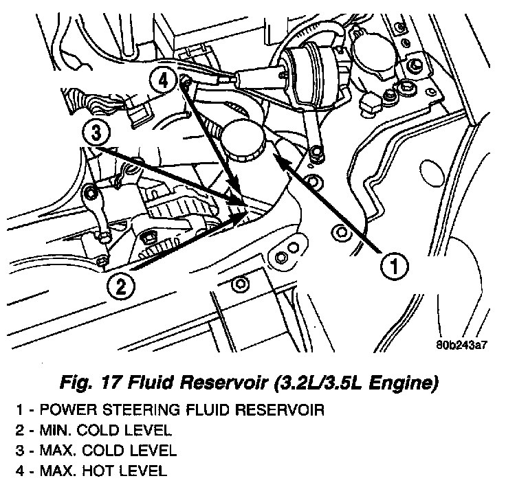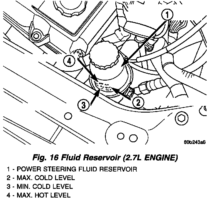 Wipe off the power steering fluid reservoir so that it is free of dirt. Check the fill level of the power steering fluid in the reservoir according to the markings on the side of the reservoir. The MAX. COLD/MIN. COLD fluid levels are to be measured with the power steering fluid at a normal ambient temperature of approximately 32°C to 43°C (90°F to 110°F). Add fluid as necessary using only Mopar Power Steering Fluid, or equivalent. Do not use any type of automatic transmission fluid.