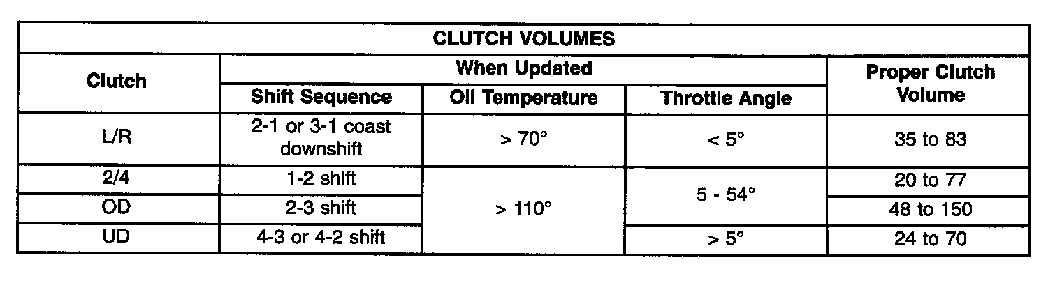 Certain mechanical problems within the input clutch assembly (broken return springs, out of position snap rings, excessive clutch pack clearance, improper assembly, etc.) can cause inadequate or out-of-range element volumes. Also, defective Input/Output Speed Sensors and wiring can cause these conditions. The chart identifies the appropriate clutch volumes and when they are monitored/updated: