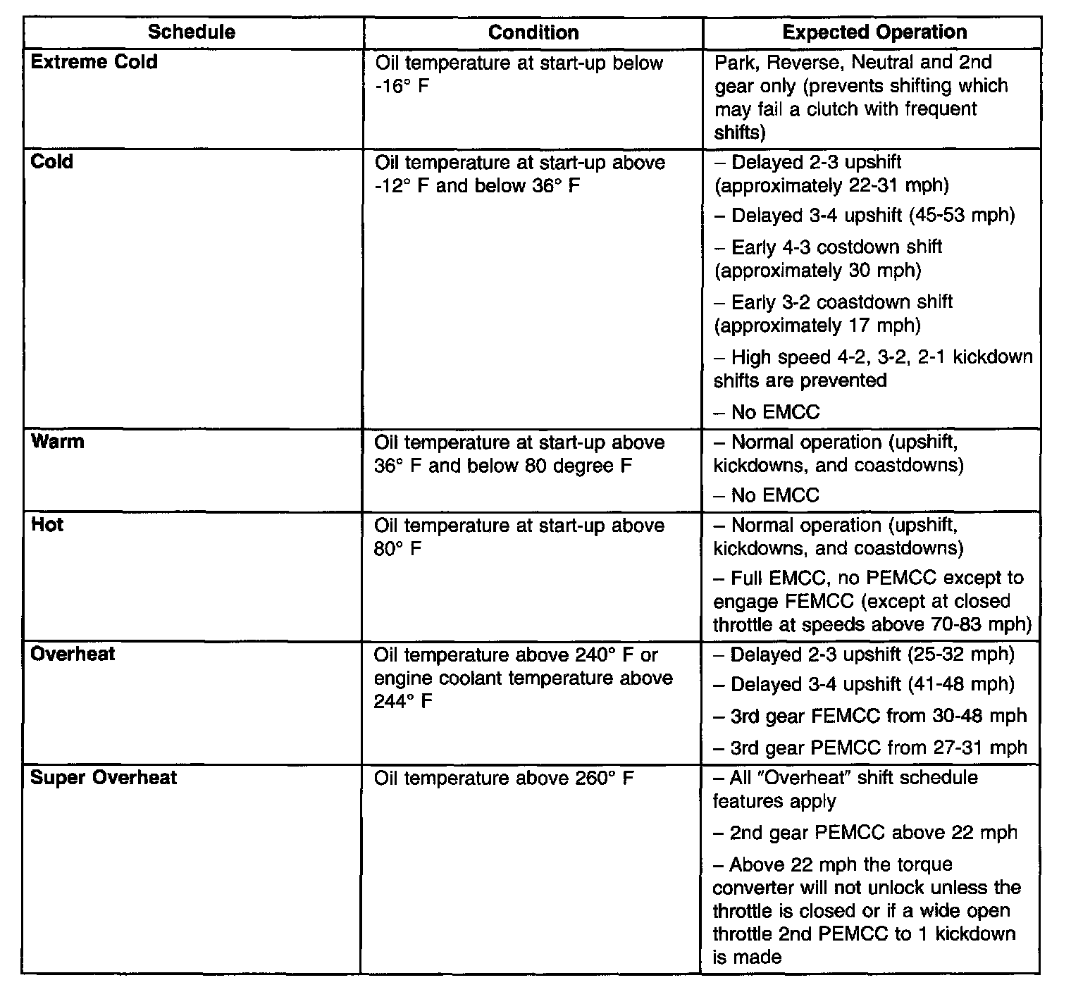 As driving conditions change, the TCM appropriately adjusts the shift schedule. Refer to the following chart to determine the appropriate operation expected, depending on driving conditions.
