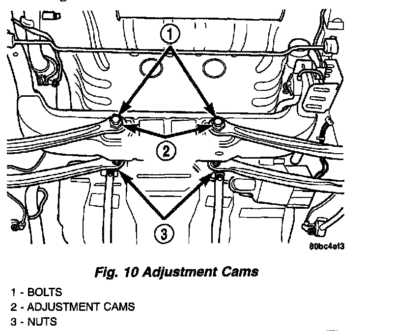 3. While holding the toe adjustment cams from turning, tighten the attaching bolt nuts. This will securely hold the adjustment cams in position. Tighten the attaching bolt nuts to a torque of 88 Nm (66 ft. lbs.).