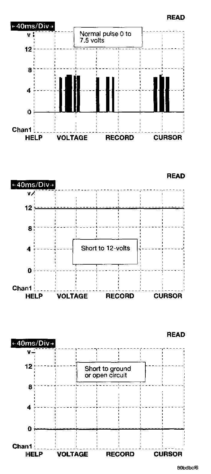 The bus messages are transmitted at a rate averaging 10800 bits per second. Since there is only voltage present when the modules transmit and the message length is only about 500 milliseconds, it is ineffective to try and measure the bus activity with a conventional voltmeter. The preferred method is to use the DRB III lab scope. The 12V square wave selection on the 20-volt scale provides a good view of the bus activity. Voltage on the bus should pulse between zero and about seven and a half volts. Refer to the figure for some typical displays.