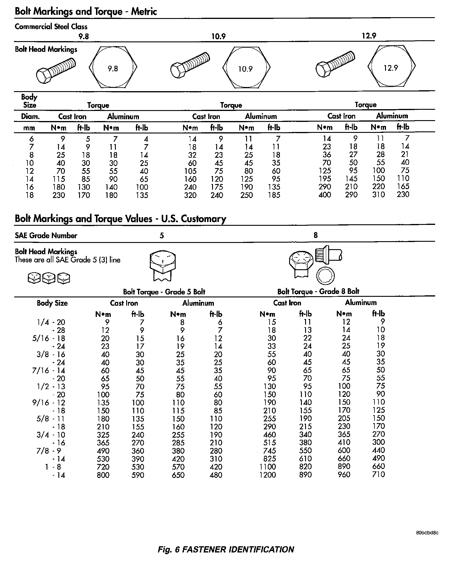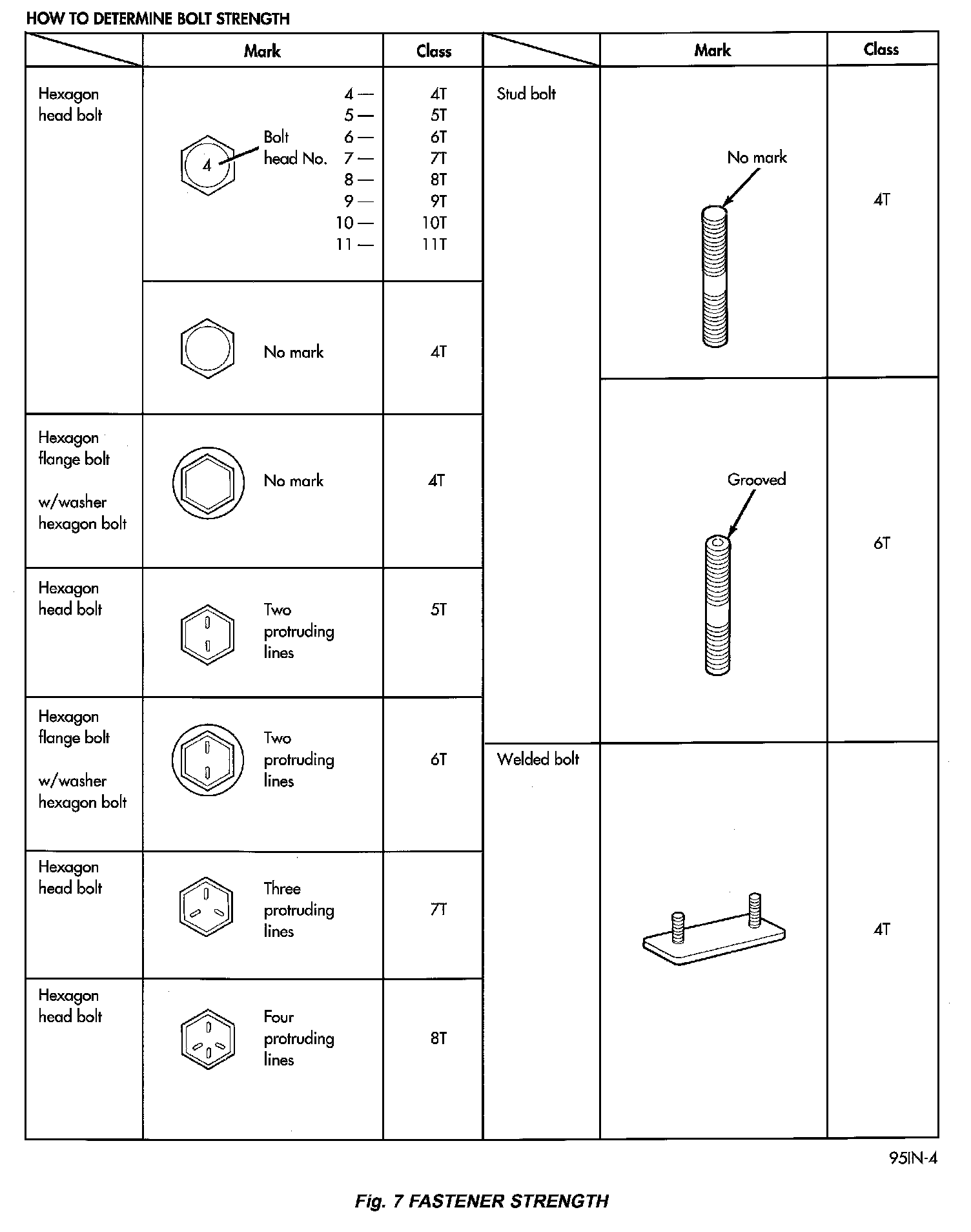 The SAE bolt strength grades range from grade 2 to grade 8. The higher the grade number, the greater the bolt strength. Identification is determined by the line marks on the top of each bolt head. The actual bolt strength grade corresponds to the number of line marks plus 2. The most commonly used metric bolt strength classes are 9.8 and 10.9. The metric strength class identification number is imprinted on the head of the bolt. The higher the class number, the greater the bolt strength. Some metric nuts are imprinted with a single-digit strength class on the nut face. Refer to the Fastener Identification and Fastener Strength Charts.