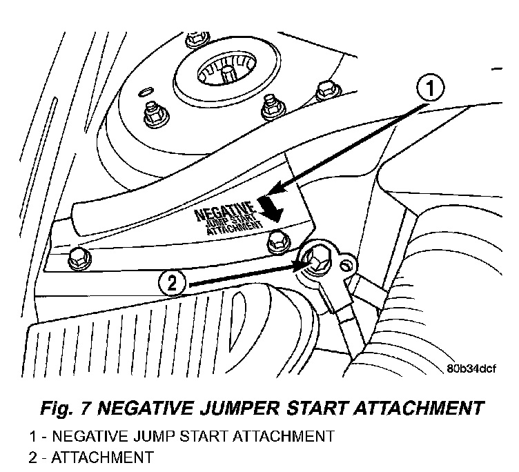 5. Connect one end of the negative jumper cable to the negative jump start attachment of the booster battery. Connect the other end of the cable to the negative jump start attachment of the discharged battery (Fig. 7). Ensure that the jump cable clamps have good connections.