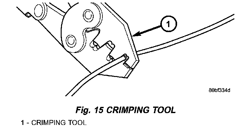 4. Using crimping tool, Mopar P/N 05019912AA, crimp the splice clip and wires together (Fig. 15).