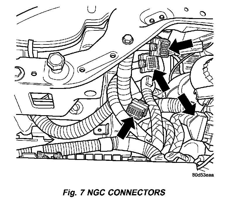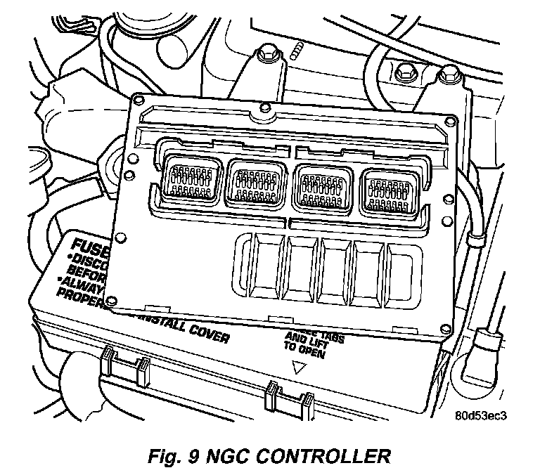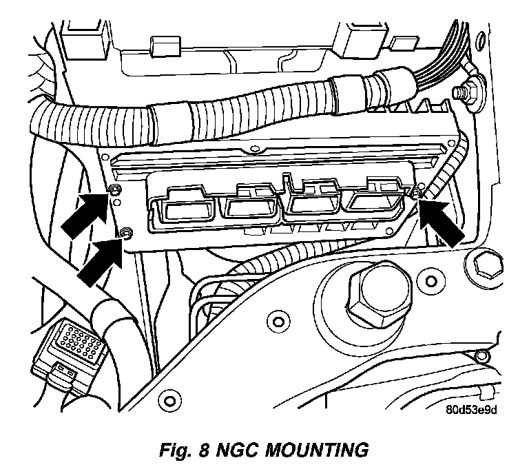 USE THE DRBIII(R) SCAN TOOL TO REPROGRAM THE NEW PCM WITH THE VEHICLES ORIGINAL IDENTIFICATION NUMBER (VIN) AND THE VEHICLES ORIGINAL MILEAGE. IF THIS STEP IS NOT DONE A DIAGNOSTIC TROUBLE CODE (DTC) MAY BE SET.