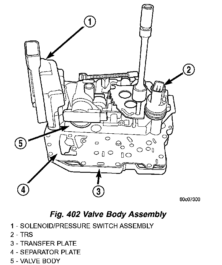 The Transmission Range Sensor (TRS) is mounted to the top of the valve body inside the transaxle and can only be serviced by removing the valve body assembly The electrical connector extends through the transaxle case (Fig. 402).