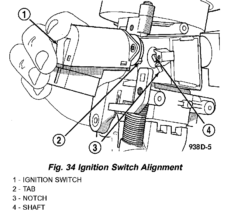 1. A tab on the ignition switch indexes to a notch in the lock cylinder housing (Fig. 34). Also, a slot in the end of the ignition switch fits over the shaft in the end of the lock cylinder housing. Use the ignition key to rotate the lock cylinder to align the ignition switch with lock cylinder housing.
